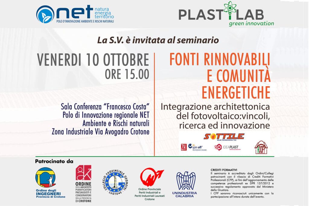 Il Seminario dal Titolo “Fonti rinnovabili e comunità energetiche”, organizzato dal Polo NET in collaborazione con Plastilab, si terrà venerdì 10 ottobre 2025, alle ore 15:00, presso la Sala conferenze “Francesco Costa” del Polo NET, a Crotone in Via Avogadro – Zona Industriale.