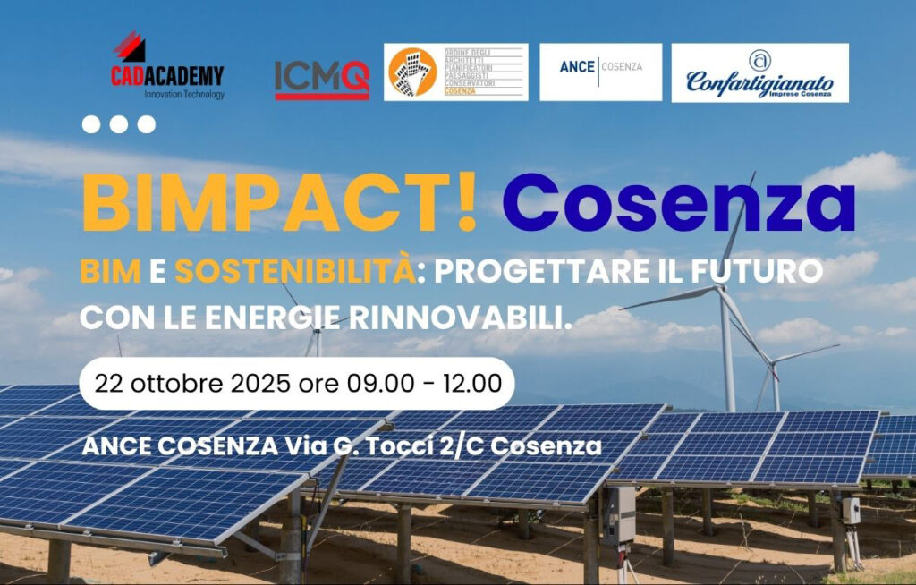 “BIM e sostenibilità: progettare il futuro con le energie rinnovabili” è il tema della seconda edizione di ‘BIMPACT Cosenza’ che si svolgerà il prossimo mercoledì 22 ottobre alle ore 09.00, presso la sede di ANCE Cosenza, in via G. Tocci 2/C.