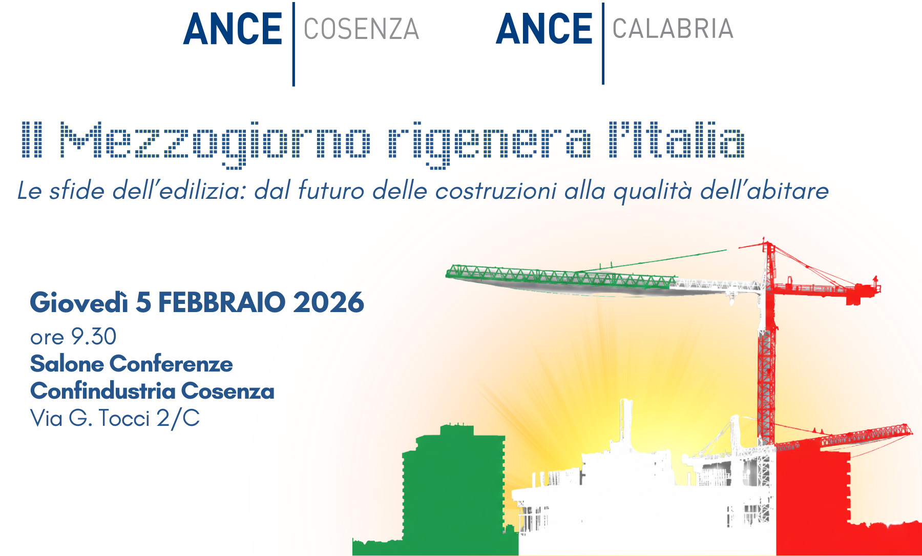 Si svolgerà il prossimo giovedì 5 febbraio 2026 a Cosenza il convegno “Il Mezzogiorno rigenera l’Italia. Le sfide dell’edilizia: dal futuro delle costruzioni alla qualità dell’abitare.