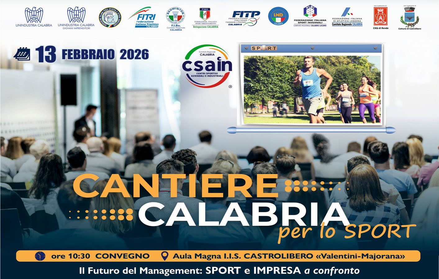 Prosegue con determinazione il percorso di formazione dedicato al management sportivo e aziendale nel territorio calabrese. Venerdì 13 febbraio si terrà l’evento “Cantiere Calabria per lo Sport”, una manifestazione che si articolerà in due sessioni complementari tra Castrolibero e Rende, consolidando la storica sinergia tra CSAIn Calabria (Centri Sportivi Aziendali e Industriali) e Unindustria Calabria.
