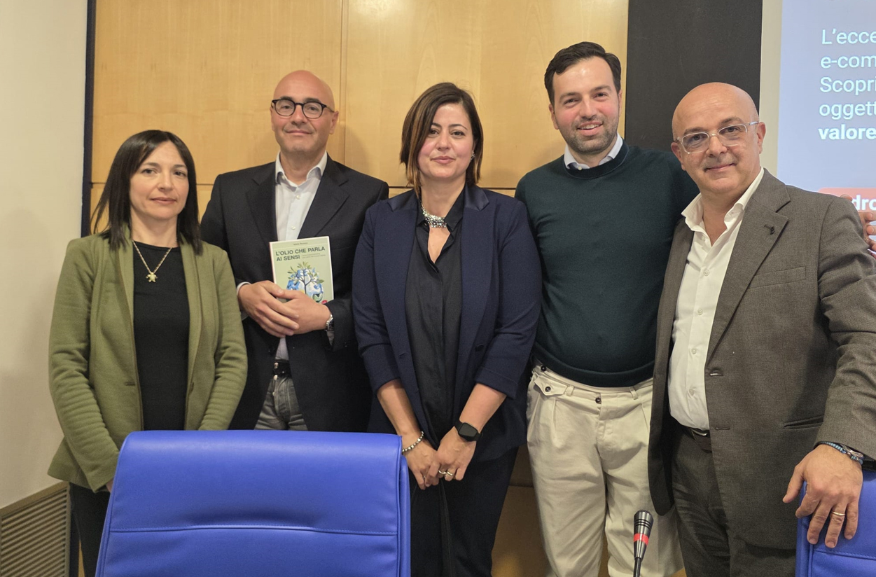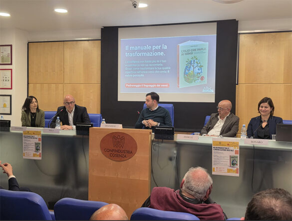Al tavolo dei relatori il presidente della Sezione Editoria e Comunicazione di Unindustria Calabria Massimo Fedele, il presidente dei Giovani Imprenditori Giorgio Franzese che ha portato anche i saluti del presidente di Confindustria Cosenza Giovan Battista Perciaccante, il presidente della Sezione Agroalimentare Luigi Nola di Confindustria Cosenza, la giornalista e sommelier Francesca Oliverio, l’imprenditrice, autrice del volume “L’olio che parla ai sensi” e Consigliera della Sezione Editoria di Unindustria Calabria Adele Bonaro.